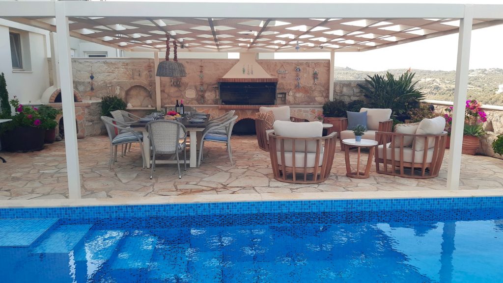 The outdoor living area of this holiday villa in Almyrida is designed for relaxed al fresco dining and entertaining. Under a large pergola you’ll find a spacious barbecue area, a generous dining table for the whole group, and a comfortable lounge area — all with beautiful views of the sea and the White Mountains.
